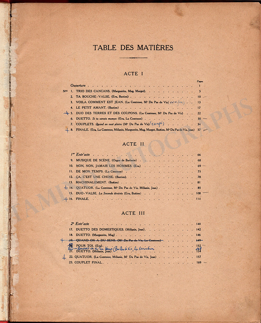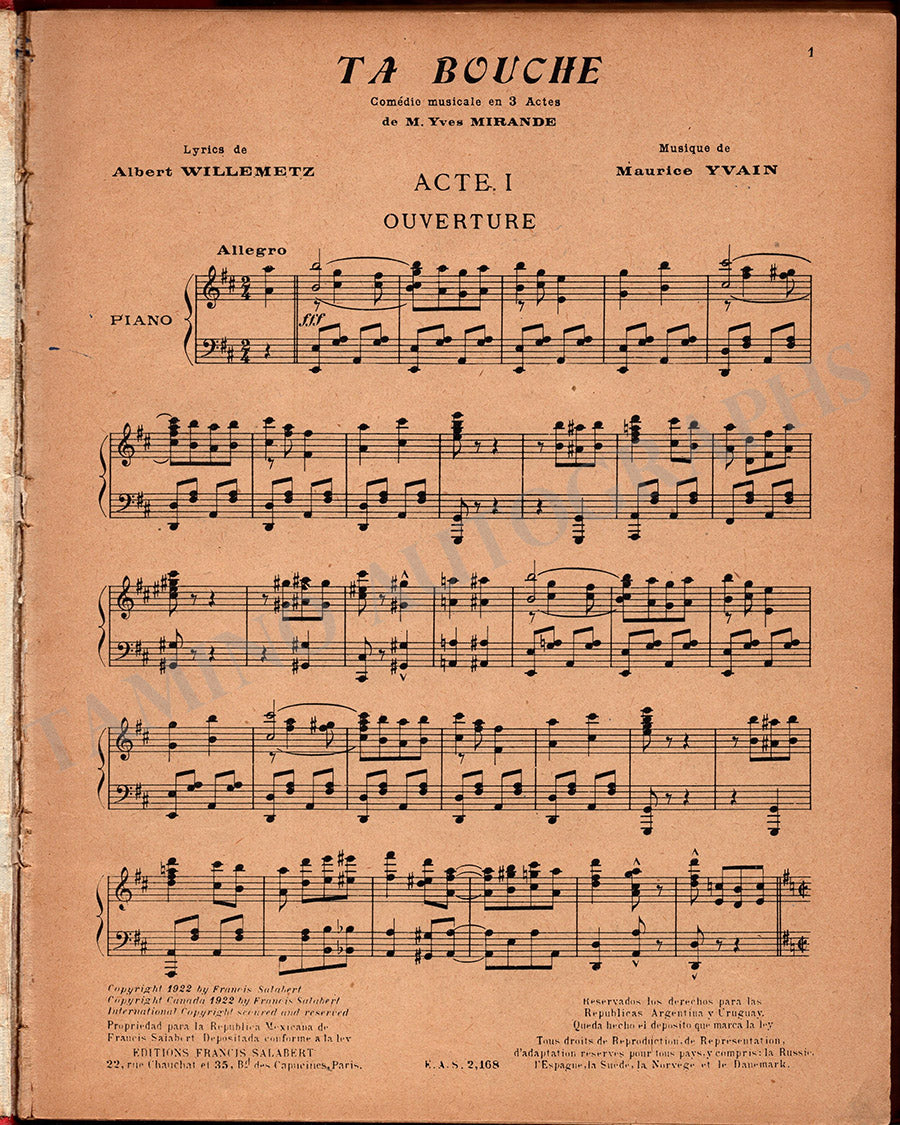 Rare autographed score for his work "Ta Bouche" ("Your Mouth"), a musical comedy in 3 acts, composed in 1921. Boldly signed by Yvain on the back of the index page. Yvain indicates in French that this was his first operetta, and inscribes his autograph, dating it in 1957.