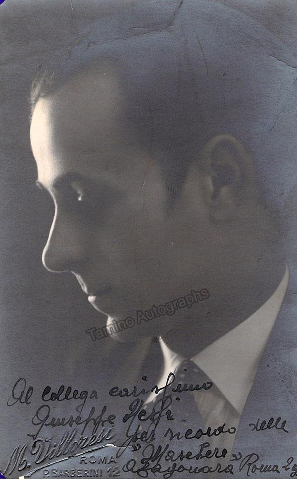 Italian tenor (1905-?), signed photo postcard, shown as himself, inscribed. Blind stamped by photographer A. Villoresi, Rome. Size is 3.5 x 5.5 inches, some silvering, otherwise in good condition.