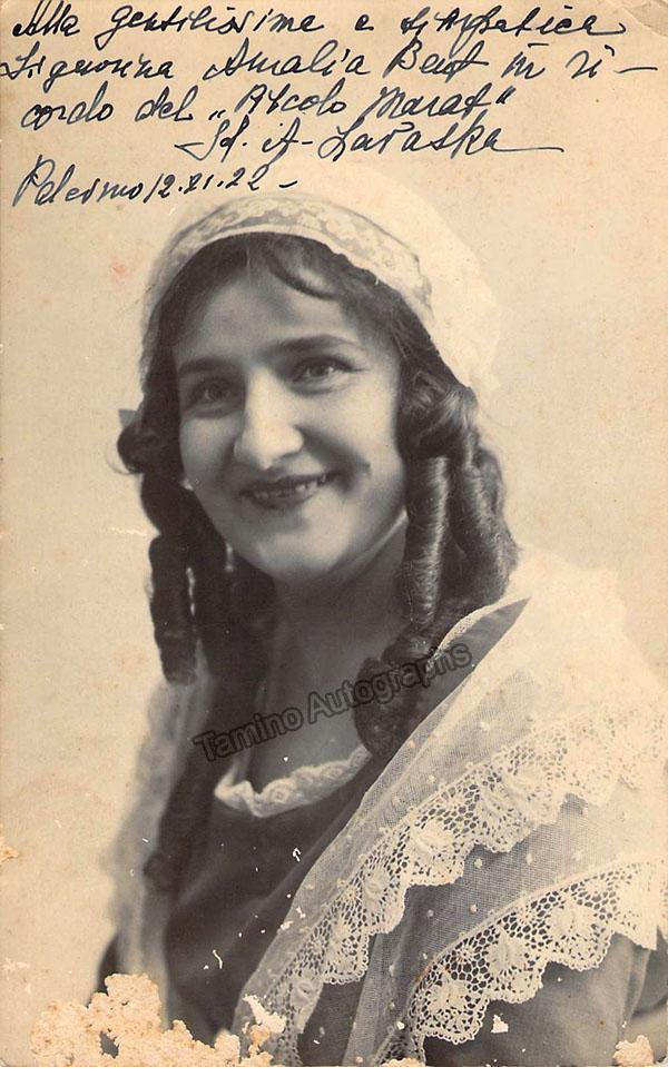 Polish soprano (1899-1988), signed photo postcard, shown in role (possibly in Piccolo Marat), inscribed in Palermo, dated in 1922. Stamped on verso by photographer Giovanni Romano, Palermo. Size is 3.5 x 5.5 inches, in excellent condition.