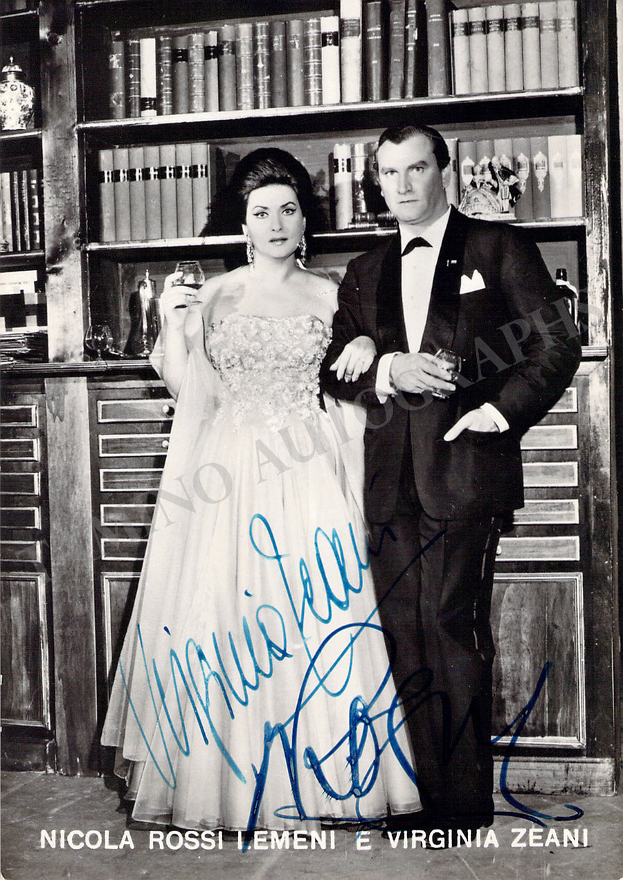 Romanian soprano (1925-2023) and Turkish-born Italian bass (1920-1991), married to each other from 1957-1991, double signed postcard photograph, shown as themselves. Photo by Farabola photo studio, Milan. Size is 4 x 5.75 inches, in excellent condition.