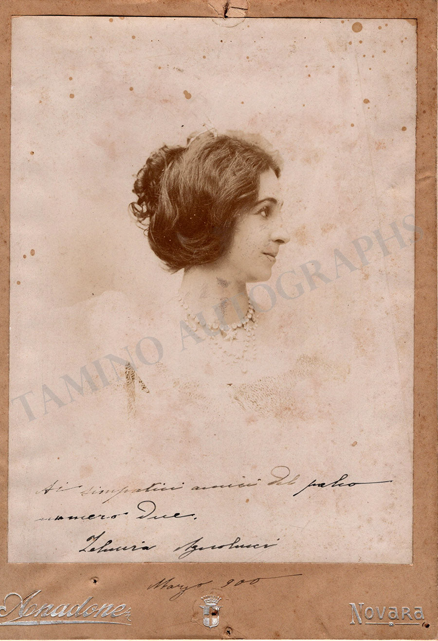 Black-and-white imperial cabinet photograph signed and inscribed by her with a short sentiment dated 1900, mounted on a mat by photographer Anadone (Novara). Total size is 6.9 x 9.75 inches, minor stains, in very good condition.