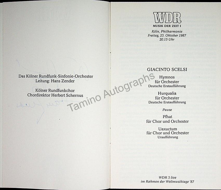 Zender, Hans - Signed Program Cologne 1987 - Tamino Zender, Hans - Signed Program Cologne 1987 - Tamino