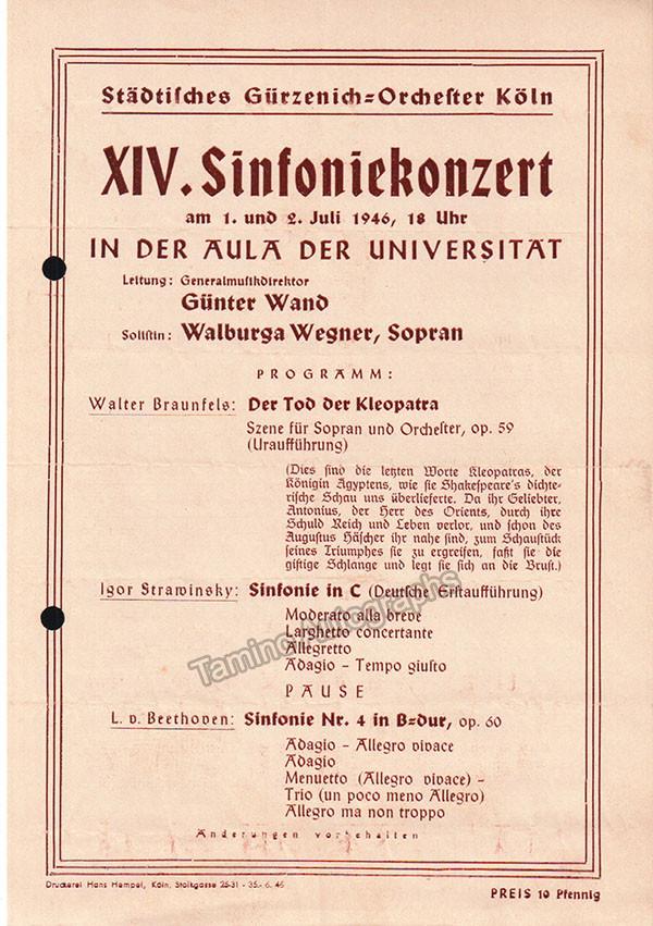 2 programs for world premiere concerts conducted by Gunter Wand in Cologne, May and July, 1946.