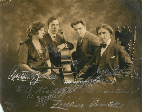 Famous string quartet, very active during the first quarter of the 20th century in concerts and recordings. Great photo signed in white ink by all in the early 1920s. Artists signing are violist Joseph Zoellner (1862-1950) who founded the string Quartet around 1904, first violinist Antoinette Zoellner (1885-1962), second violinist Amandus Zoellner (1892-1955) and cellist Joseph Zoellner Jr. (1886-1964). Beautiful photograph, inscribed, 9.5 x 7.5 inches. Good condition, minor creases and a small piece is missing over the lower left corner, rare!