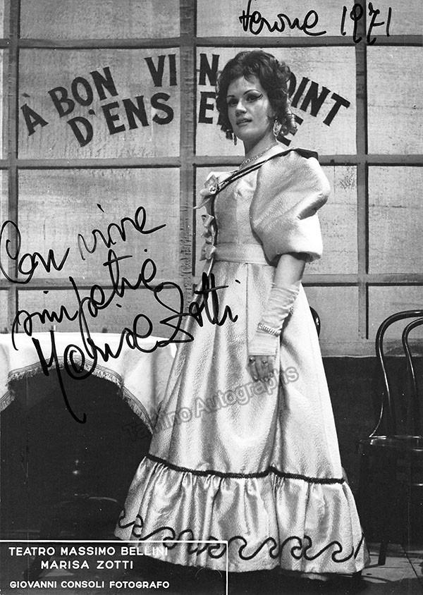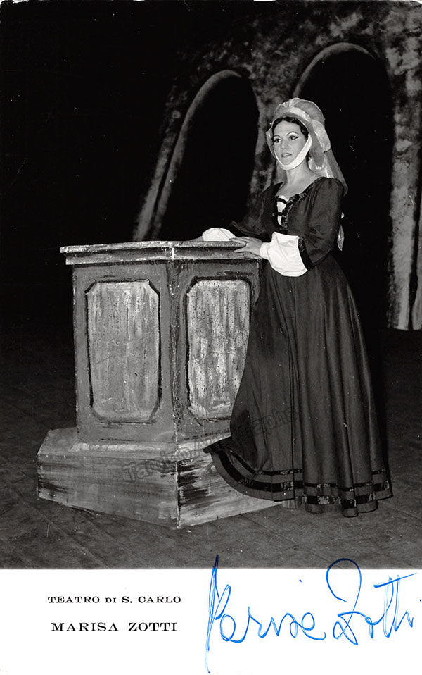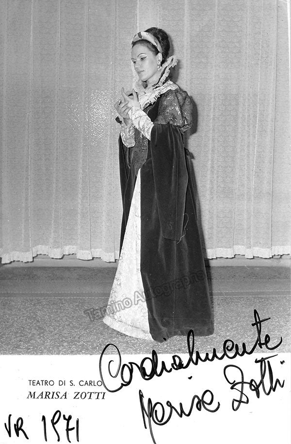 Signed photograph, shown as Queen Elisabetta in Verdi's Don Carlo, dated in 1971. Stamped on verso by photographer Troncone, Naples. Size is 4.75 x 7 inches, very slight creases on edges, otherwise in excellent condition.
