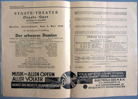 Fritz Zweig conducts at the Staatsoper Berlin. Le Domino Noir, Daniel Auber. With an announcement of 3 Berlin performances by Feodor Chaliapin: Boris Godonov, Margarete, Don Quichote.