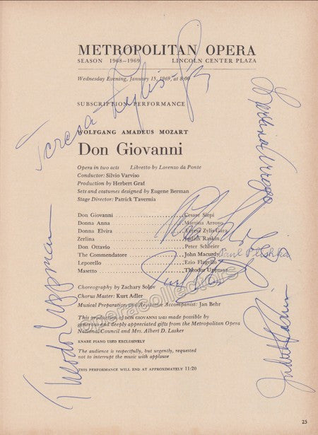 Don Giovanni, Met Opera, Jan. 15th 1969, signed cast page (not full program), 8 x 11 inches (20 x 27.5 cm)
